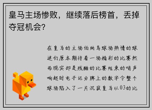 在皇马的主场——伯纳乌球场,热情的球迷们原本期待着一场精彩的比赛,然而现实却是残酷的。比赛结束的哨声响起时,电子记分牌上的数字令整个球场陷入了一片沉寂。皇马以0-3的比分惨败,这不仅让球迷们心痛,也让整个球队陷入了前所未有的危机。这场失利的背后隐藏着许多问题,这些问题若不解决,将很可能导致皇马在本赛季彻底失去争夺联赛冠军的机会。